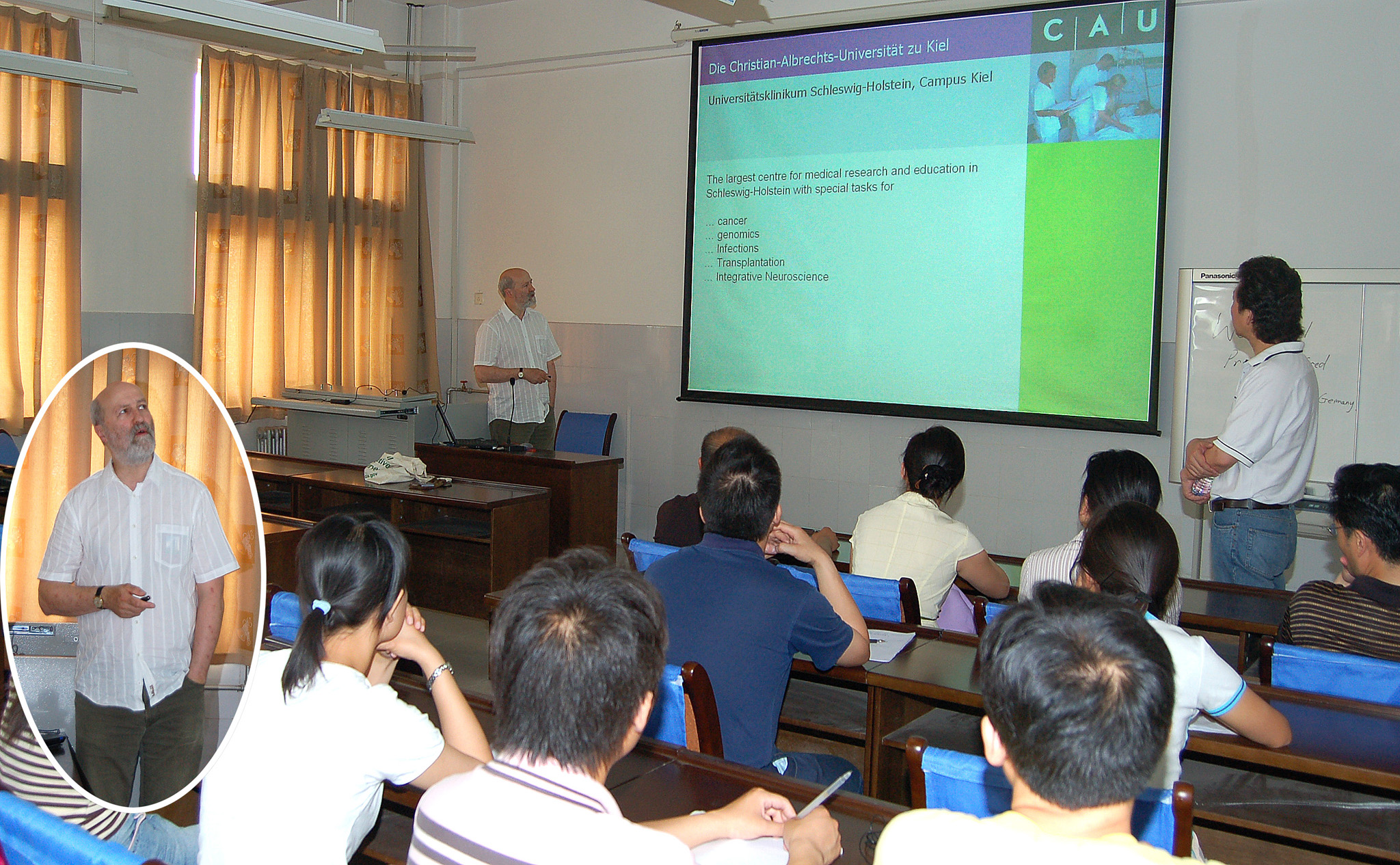 5月27日,德国基尔大学极地生态研究所Manfred Bölter 教授应邀来我校讲学,副校长高丹盈为Manfred Bölter 教授颁发了客座教授聘任证书。5月28日,Manfred Bölter 教授在环工实验室作了报告。他介绍了德国大学教学、科研和学生日常生活的一些基本情况,然后做了题为《土地利用变化与多学科合作研究》 的学术报告。