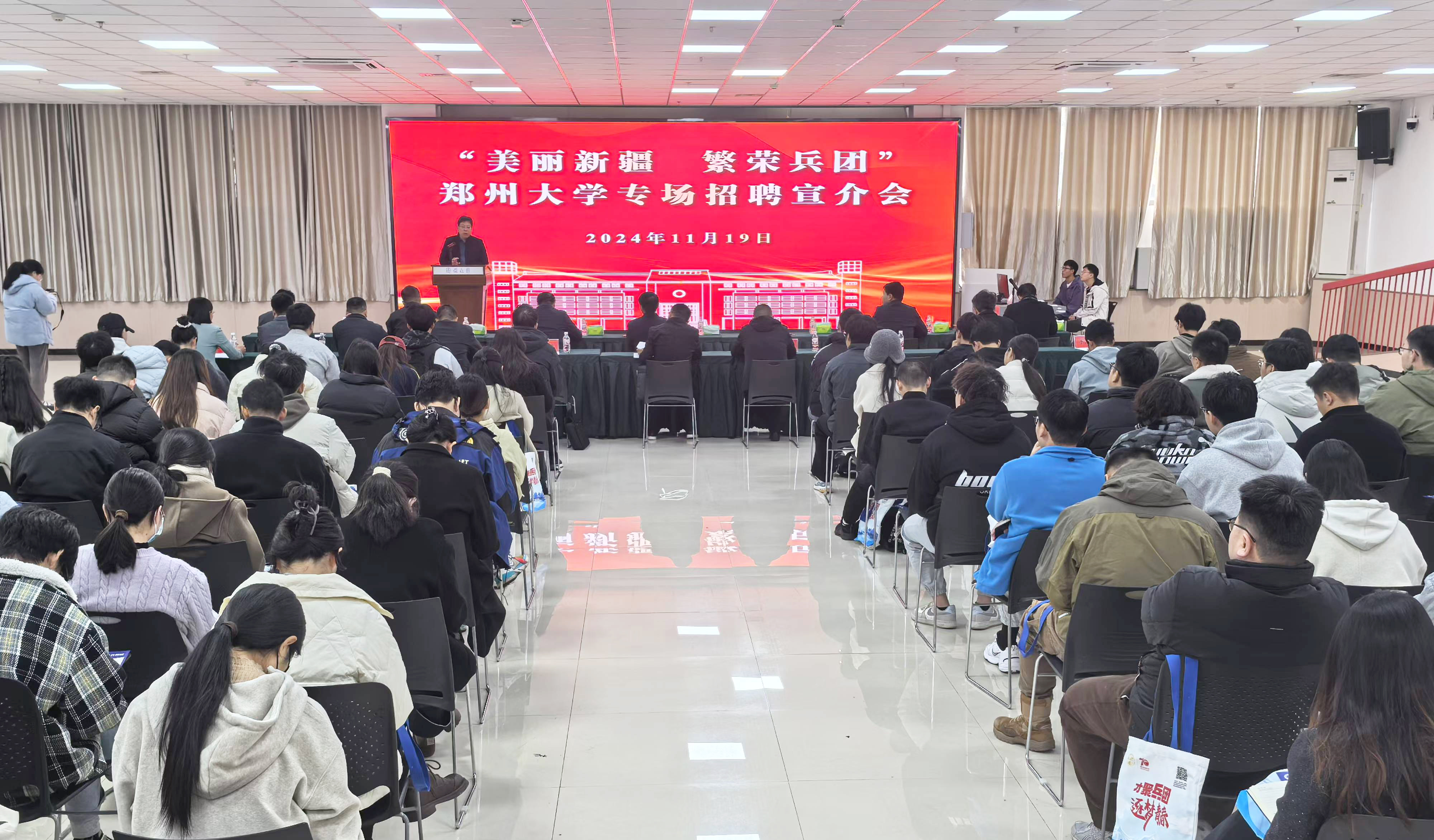 李学明详细介绍了兵团的基本情况、人才政策以及广阔的发展前景。他表示,兵团是一块拥有红色血脉的大地,是一片创造奇迹、充满机遇的沃土,愿意为每一位郑大学子施展抱负、一展所长提供广阔舞台。他希望,更多优秀的学生能够奔赴兵团、圆梦兵团,在服务国家战略中更好实现人生价值。