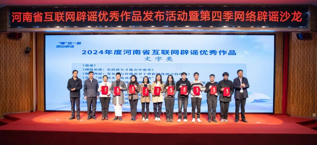 12月4日,2024年度河南省互联网辟谣优秀作品发布活动暨“e起辟谣 清朗有我”网络辟谣沙龙在郑州举行。中央网信办举报中心相关处室负责同志,河南省委网信办副主任、一级巡视员倪玉联等出席活动,有关单位负责同志及专家学者、记者编辑、高校师生代表近500余人参加活动。beat365在线唯一官网积极参与2024年度河南省互联网辟谣优秀作品征集活动,获评“优秀组织单位”,学校选送作品《追逐》,获评河南省互联网辟谣优秀作品文字类一等奖。
