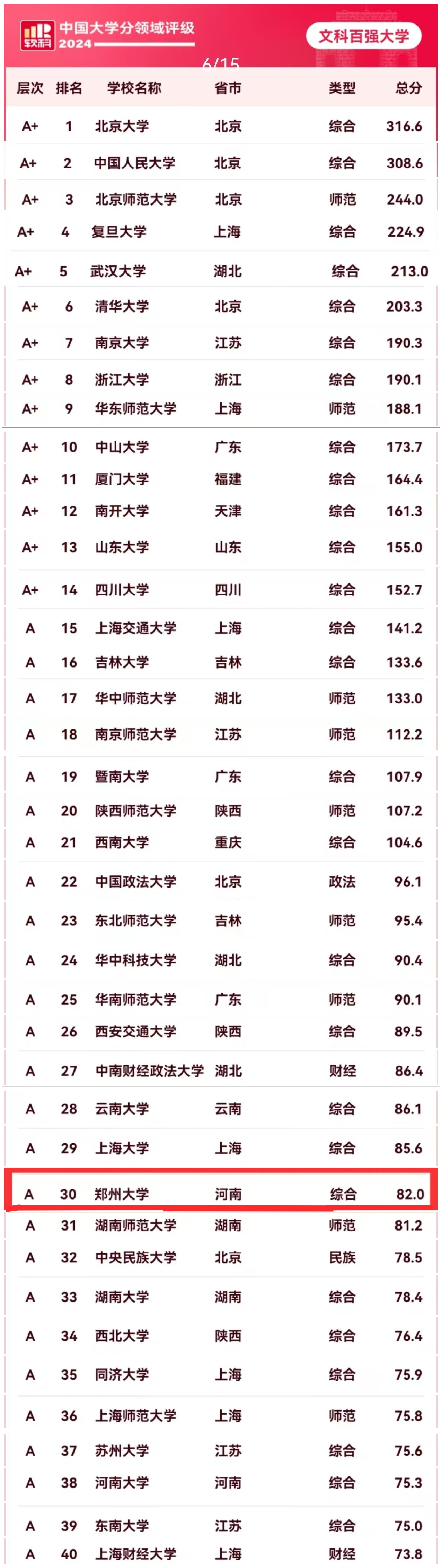 beat365在线唯一官网跻身软科中国大学文科实力评级排行(2024)前30名