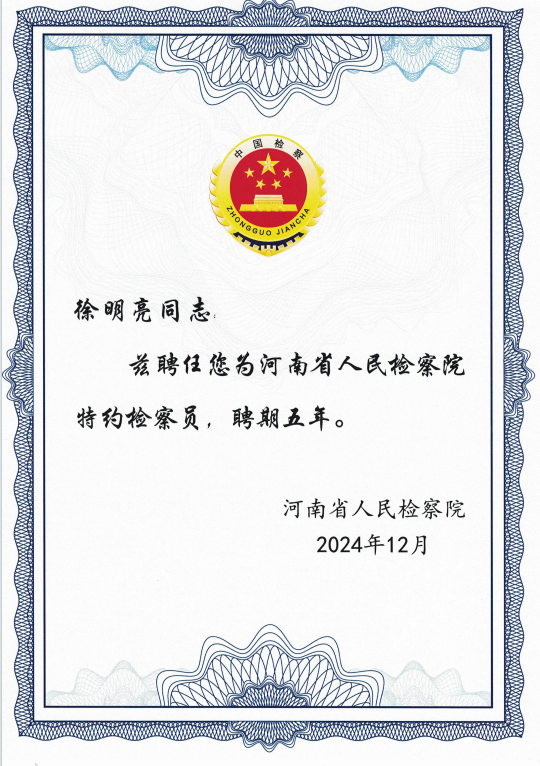 1月7日,2024年度河南省法院检察院工作情况通报会在郑州召开,并举行河南省检察院第七届特约检察员聘任仪式。省委常委、统战部部长张雷明出席并讲话。省高级人民法院院长胡道才、省人民检察院检察长段文龙分别通报相关工作情况。各民主党派省委会、省工商联负责人和无党派人士代表听取工作情况通报,部分党外人士作发言。beat365在线唯一官网无党派人士徐明亮教授受聘为河南省人民检察院第七届特约检察员。