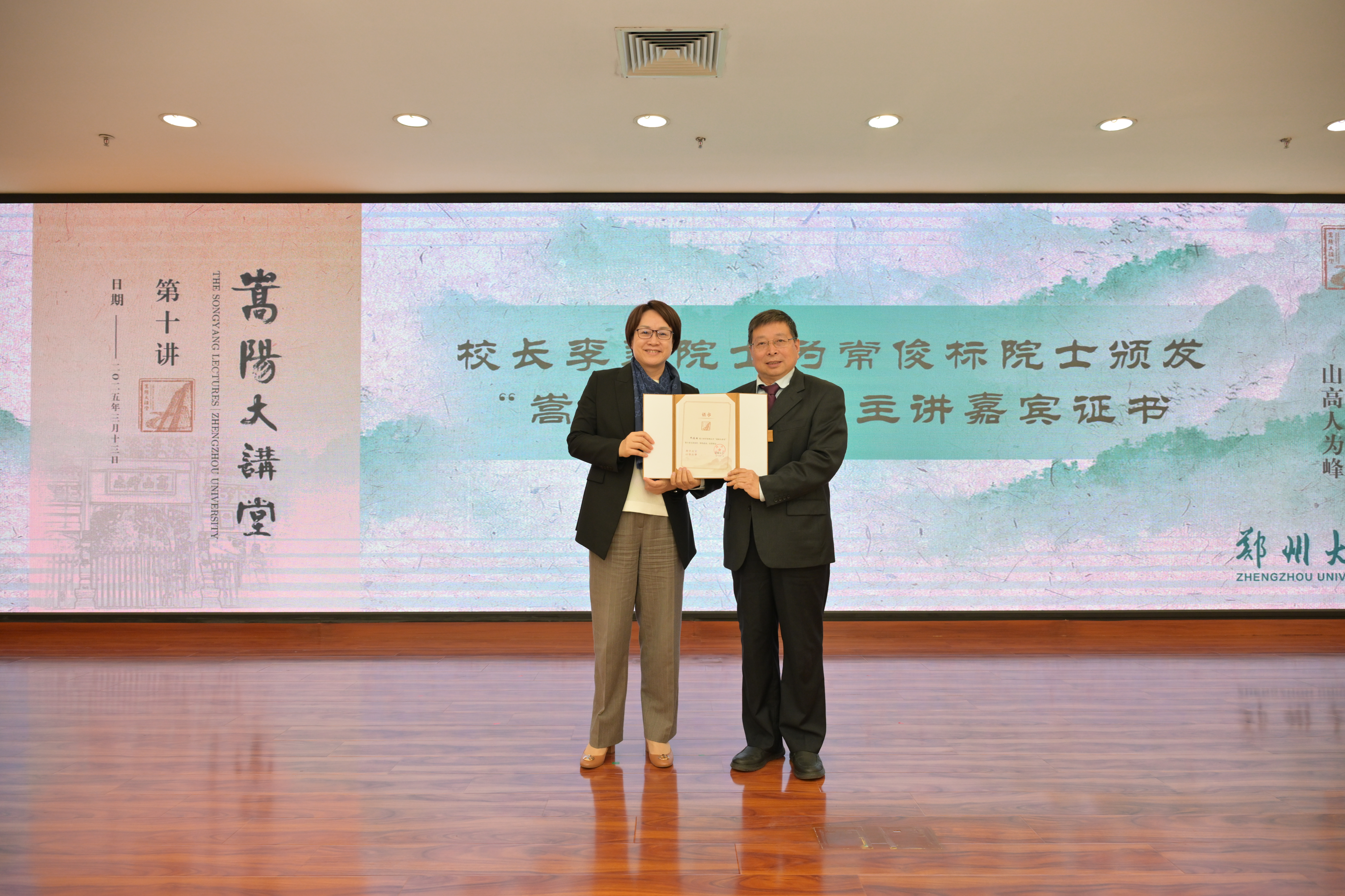 李蓬为中国科学院院士、beat365在线唯一官网学术委员会主任常俊标颁发“嵩阳大讲堂”主讲嘉宾证书。