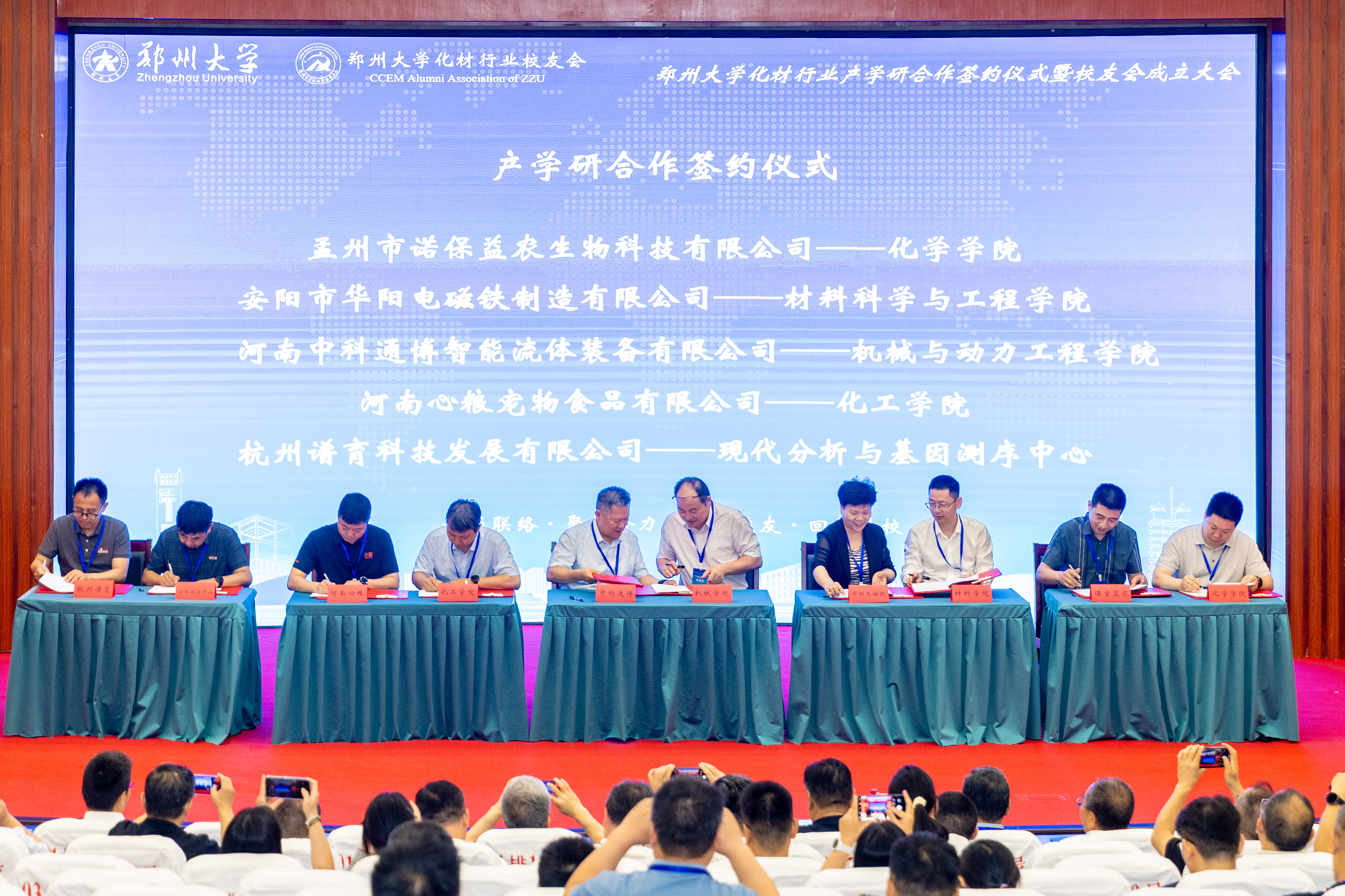 化学学院、材料科学与工程学院、机械与动力工程学院、化工学院、现代分析与基因测序中心分别与孟州市诺保益农生物科技有限公司、安阳市华阳电磁铁制造有限公司、河南中科通博智能流体装备有限公司、河南心粮宠物食品有限公司、杭州谱育科技发展有限公司等5家单位签订产学研合作协议。