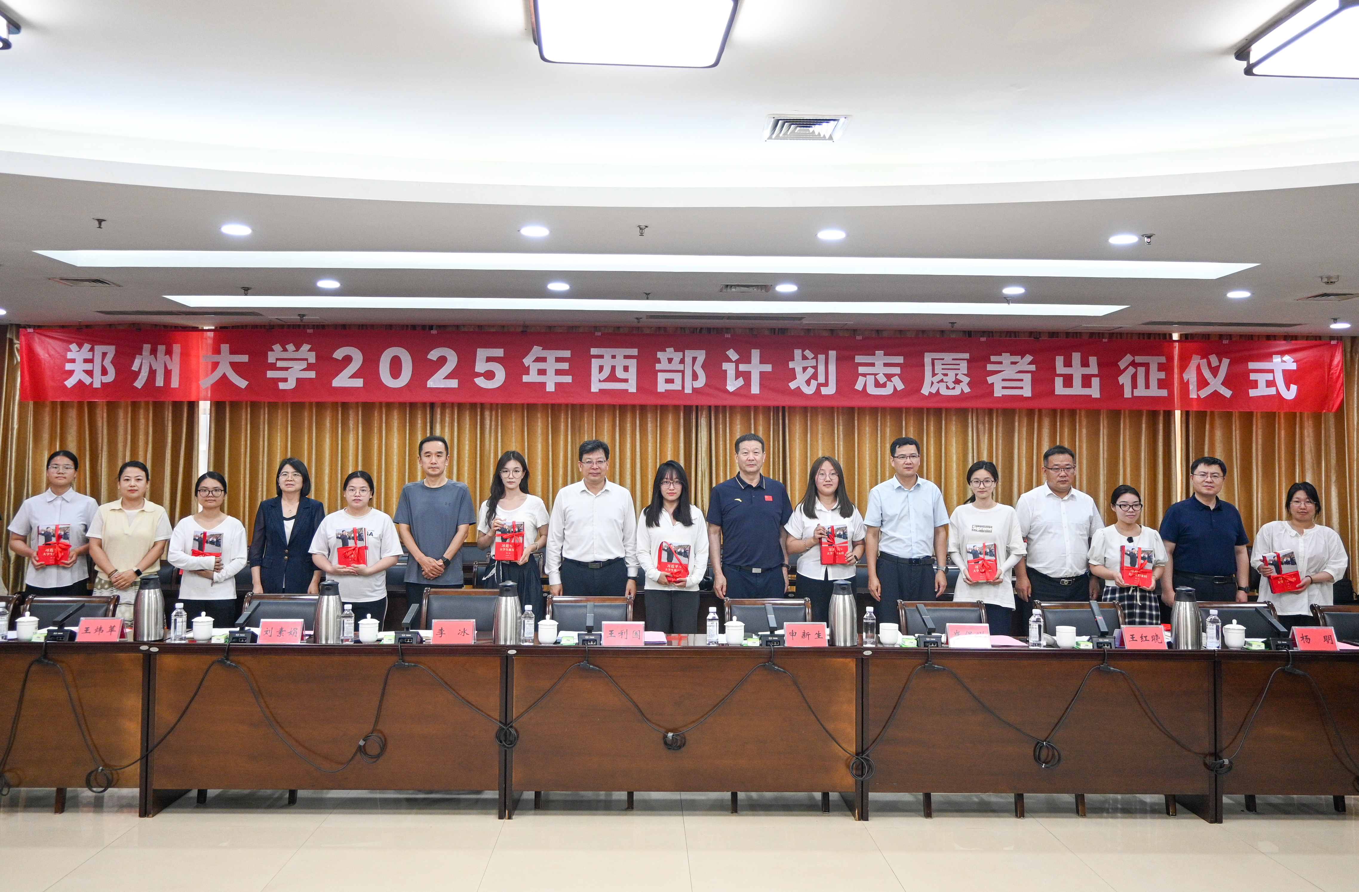 王利国和志愿者们交流并讲话。他代表学校向入选本届西部计划的全体志愿者表示祝贺。他指出,同学们积极响应党和国家的号召,用实际行动诠释了“求是 担当”的郑大校训精神,充分展现出新时代青年勇担使命、甘于奉献的青春风采。他结合自己在河南卢氏县参与脱贫攻坚工作的经历,鼓励同学们坚定理想信念,在西部的广袤大地上淬炼成长,建功立业。他对全体志愿者提出四点希望和要求:一是心怀“国之大者”,做信念坚定的“摆渡人”,深刻学习领会习近平总书记对青年、对西部计划志愿者的重要指示精神和回信要求,将爱国情、强国志、报国行自觉融入服务西部、建设祖国的具体行动中;二是扎根基层沃土,做本领过硬的“实干家”,真正沉下身子、迈开步子,发扬“螺丝钉”精神,将所学的专业知识与西部的实际需求紧密结合,在解决复杂的实际问题中练就一身硬脊梁、铁肩膀、真本事;三是勇担时代重任,做创新奉献的“开拓者”,立足服务岗位,以求真务实的作风、开拓创新的精神,充分发挥专业优势和聪明才智,在教育、科技、医疗、乡村振兴等各个领域贡献郑大智慧、展现郑大力量;四是传承郑大精神,做薪火永续的“火炬手”,秉承志愿者精神,尊重当地民俗,维护民族团结,展现郑大学子严谨求实、团结进取、文明开放的良好风貌,用真诚付出和卓越表现,讲好郑大故事、传递好郑大声音。