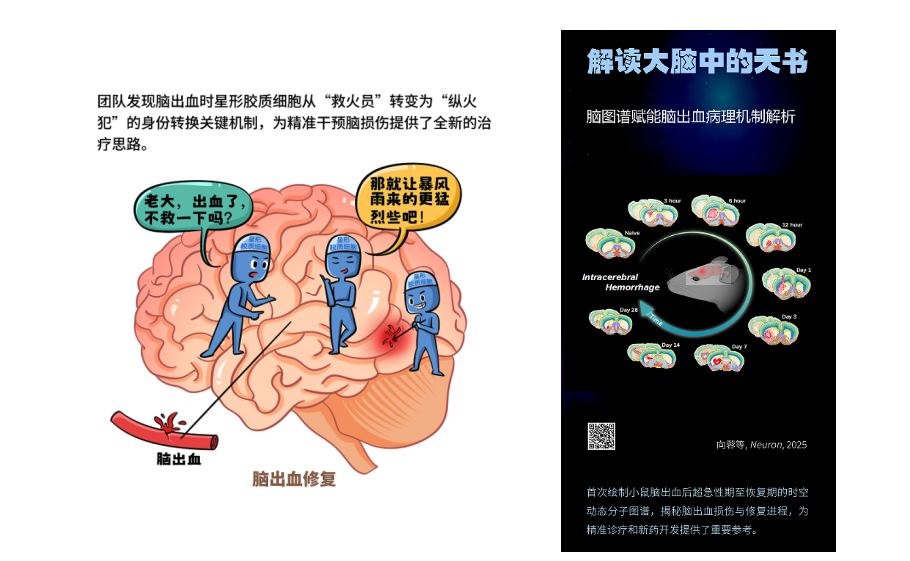 该研究系统解析了脑出血后的组织损伤与修复进程,以及以胶质细胞为代表的多种细胞类型在该过程中发挥的关键作用,揭示了血肿部位及其周边区域基因呈现的空间梯度表达模式。研究提出,大脑在脑出血后会形成一个独特的“损伤修复战场”:病灶区域最初存在受损的神经元,随后神经元死亡,区域内逐渐充满神经胶质细胞和外周血液来源的免疫细胞;至第7天,这些细胞已完全取代病灶区域原有的神经元,而反应性星形胶质细胞则会将病灶区域与相对健康的脑组织分隔开来。此外,研究还发现,脑出血并非仅为出血部位脑组织的局部病变,更涉及全脑反应。该成果为深入理解脑出血的动态病理过程提供了宝贵资源,也为临床脑出血的精准干预和个体化治疗策略提供了重要参考。