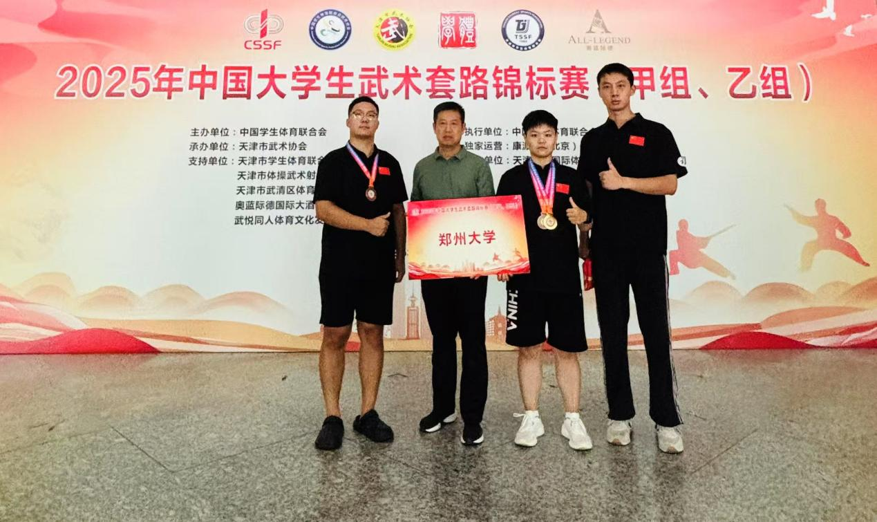 近日,由中国学生体育联合会主办、天津市武术协会承办的2025年中国大学生武术套路锦标赛(甲组、乙组)在天津市举行。本次赛事吸引了来自全国各地241所高校的2000余名运动员参赛,规模创历届之最。beat365在线唯一官网武术队奋勇拼搏,以1金2铜的佳绩载誉而归,充分展现了郑大学子昂扬向上的精神风貌。