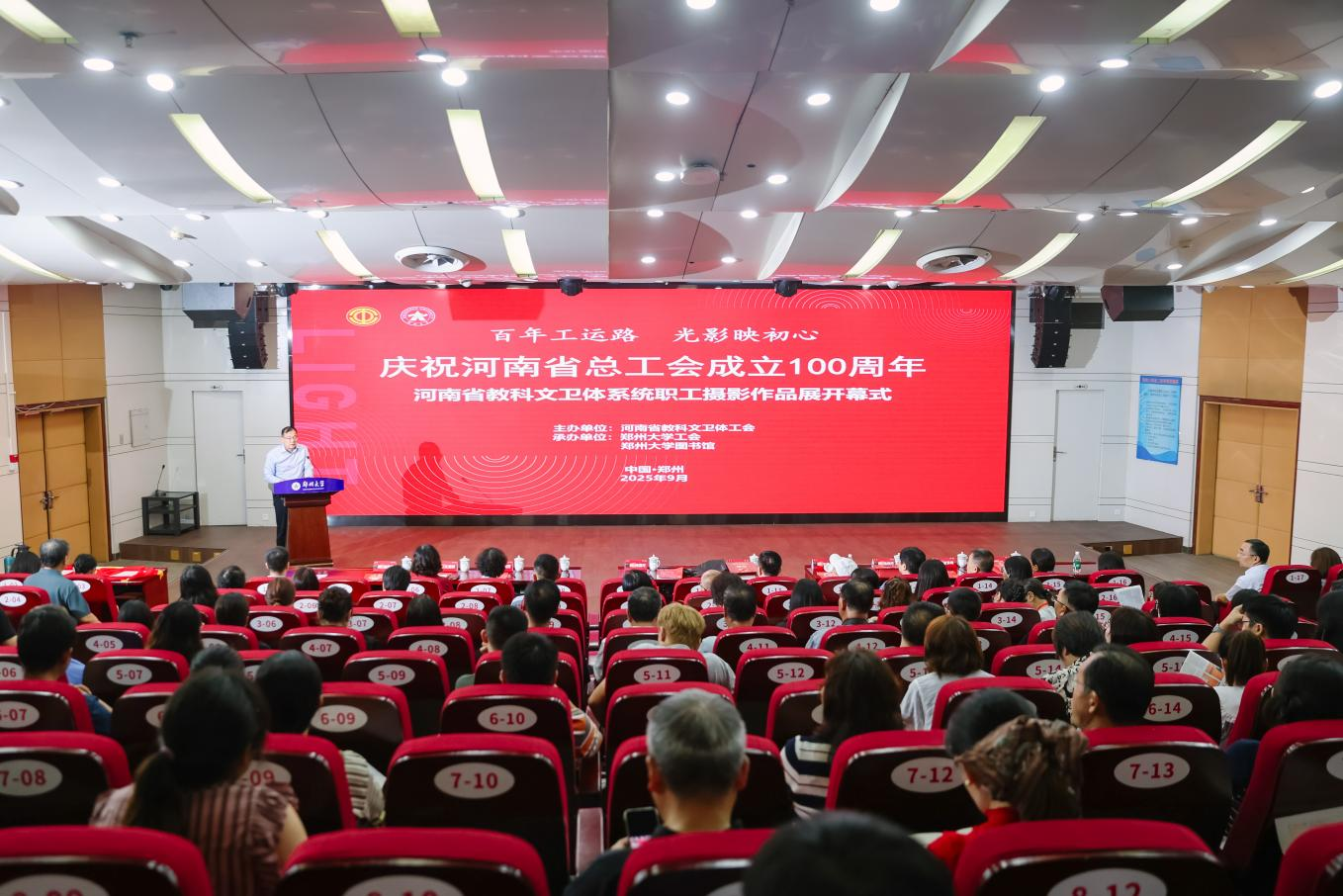 为热烈庆祝河南省总工会成立100周年,彰显工会百年发展成就,9月16日,由河南省教科文卫体工会主办,beat365在线唯一官网工会、beat365在线唯一官网图书馆承办的“百年工运路・光影映初心”职工摄影作品展在beat365在线唯一官网举行。河南省总工会副主席刘雪峰,beat365在线唯一官网党委副书记、工会主席韩国河,河南省教科文卫体工会主席张学勇,河南省摄影家协会名誉主席于德水出席开幕式。来自全省教科文卫体系统的职工代表、优秀展品作者代表等300余人参加开幕式。
