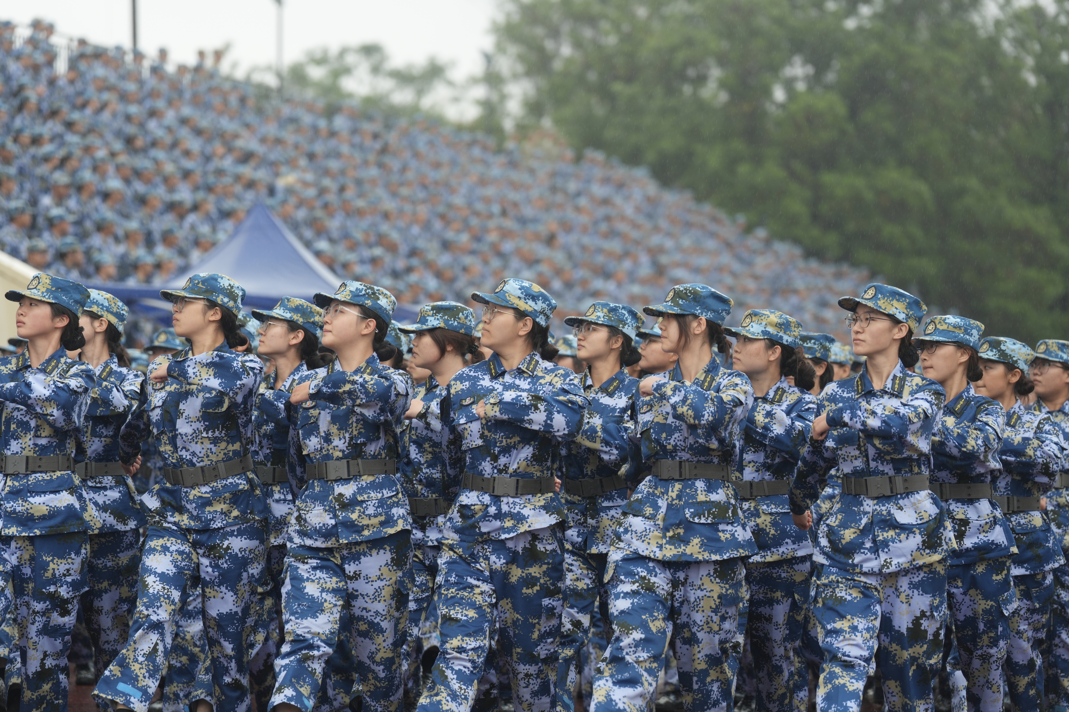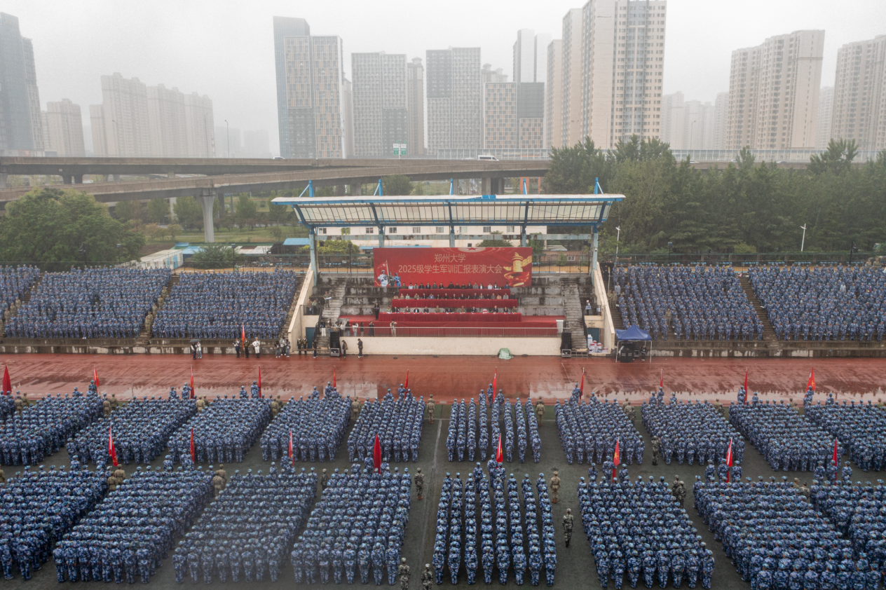 “标兵就位!”“分列式开始!”号令发出,24个军训连方队,如钢铁洪流,踏浪前行。同学们口号震天、步伐整齐,雨中挺拔的身姿更显刚毅。军事科目表演精彩纷呈:刺杀操迅猛凌厉,突刺格挡间彰显敢打必胜的坚定信念;军体拳气势磅礴,拳风腿影中展现敢于亮剑的战斗精神;女子匕首操刚柔并济,招招式式诠释巾帼不让须眉的飒爽豪情。雨水浇不灭斗志,更燃起全场激情。声声喝彩,阵阵欢呼,标志着全体新生将以此为序,迈出践行“求是 担当”郑大精神的坚实步伐。