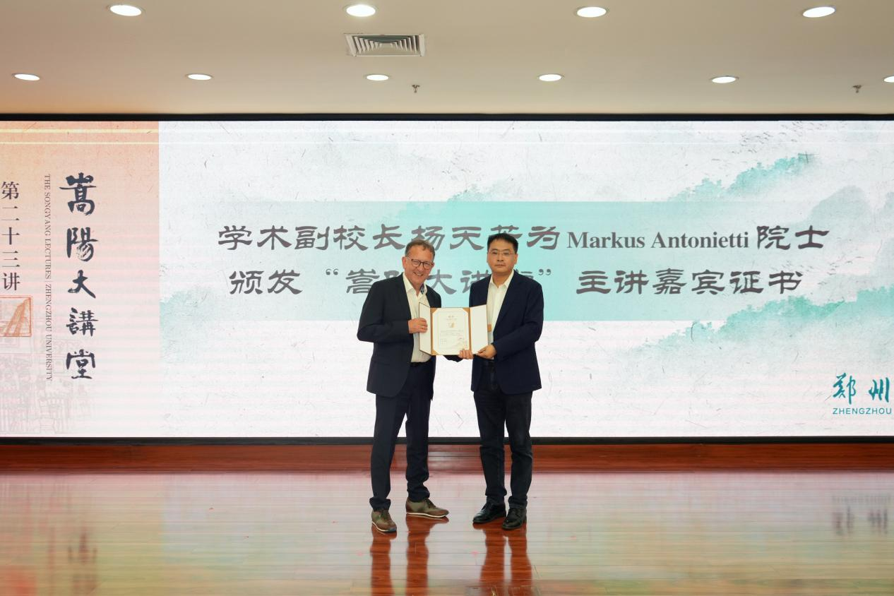 杨天若为Markus Antonietti颁发“嵩阳大讲堂”主讲嘉宾证书