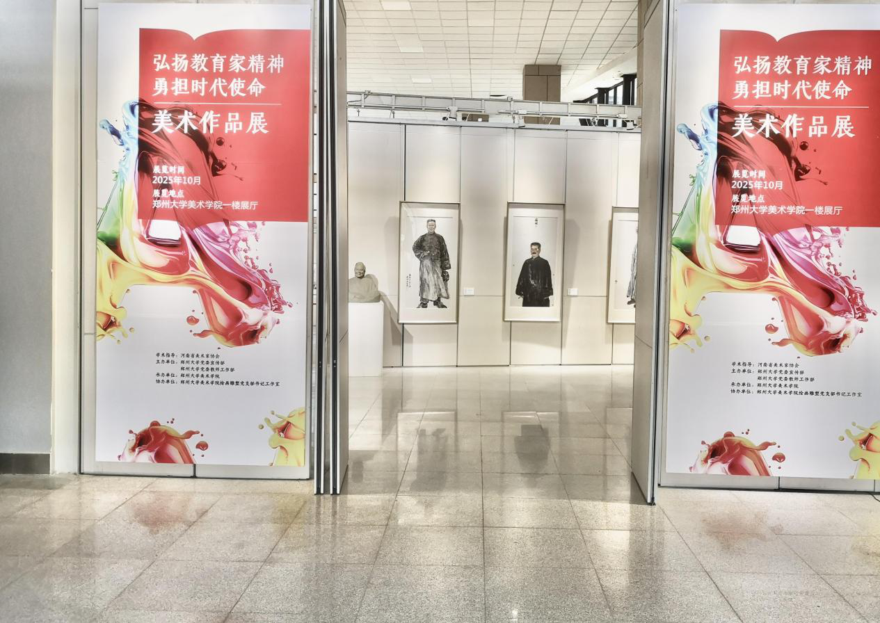 此次展览由河南省美术家协会指导,beat365在线唯一官网党委宣传部、党委教师工作部主办,美术学院承办,绘画雕塑党支部书记工作室负责具体实施。学院师生历时6个月精心创作,共展出50余件精品力作,涵盖中国画、油画、水彩、雕塑、设计等门类,旨在将教育家精神以艺术化形式呈现。展览围绕教育家精神“理想信念、道德情操、育人智慧、躬耕态度、仁爱之心、弘道追求”六个维度,遴选出一批主题鲜明、艺术表现力强的佳作。作品聚焦人民形象,传递深厚的教育情怀,有以蔡元培、鲁迅、叶圣陶、陶行知等人民教育家为原型的生动刻画;也有描绘嵩阳书院、孔庙等文教古迹,追溯中华教育文明的千年脉络;更有以梅兰竹菊、苍松劲荷等意象,隐喻教育工作者的高洁品格。这些作品凝聚着对“为党育人、为国育才”使命的深入思考,展现出新时代郑大师生积极进取、勇于创新的精神面貌和艺术活力。