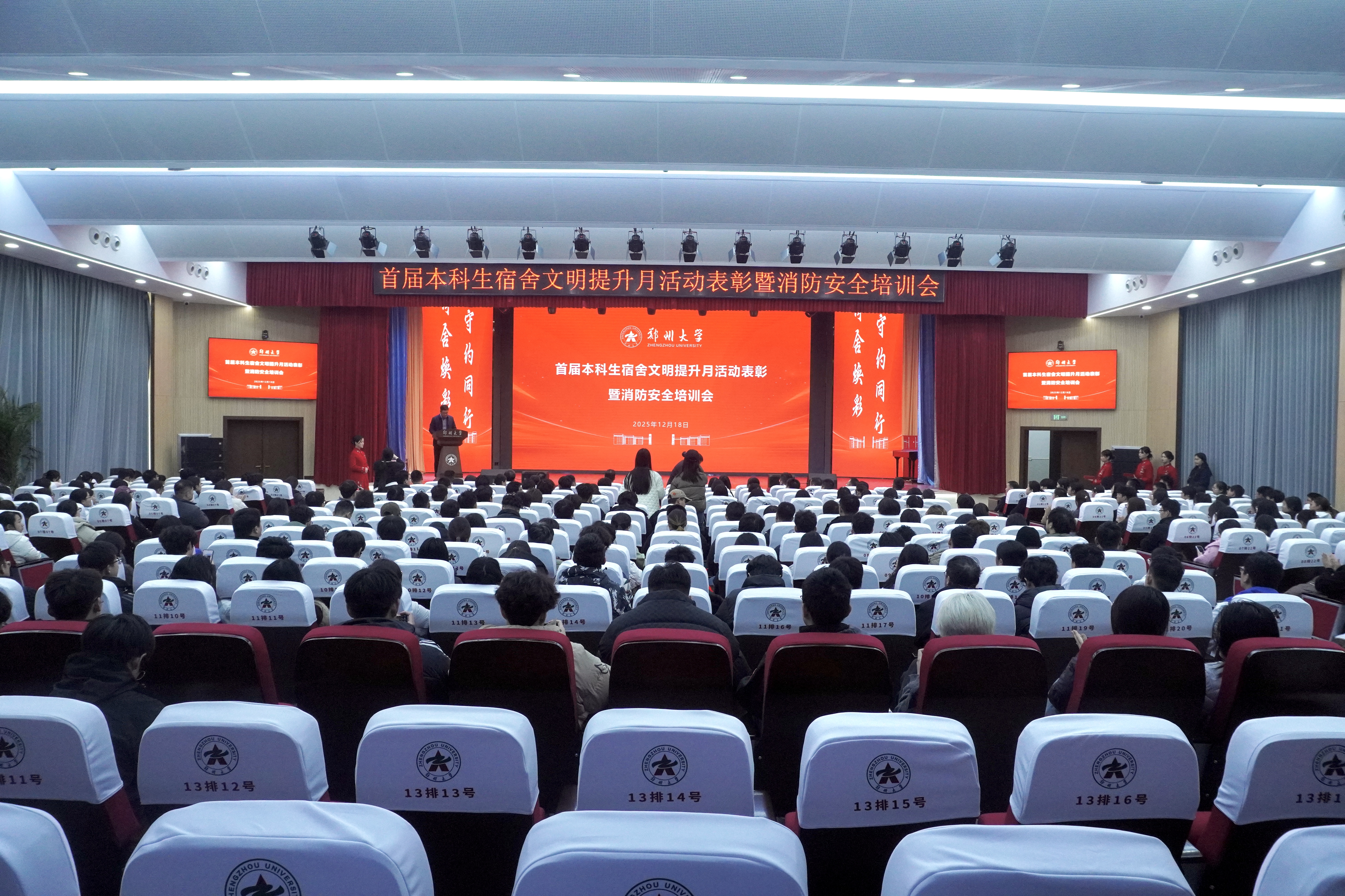 12月18日,beat365在线唯一官网首届“净舍焕彩 守约同行”本科生宿舍文明提升月活动表彰大会暨消防安全培训会在主校区举行。校党委常委、副校长徐东升,郑州市消防救援支队副支队长王新利等出席活动。党委学生工作部、保卫处、后勤保障部、各社区等相关部门负责同志,各学院、各培养单位分管学生工作负责同志、辅导员及学生宿舍长代表共300余人参加活动。