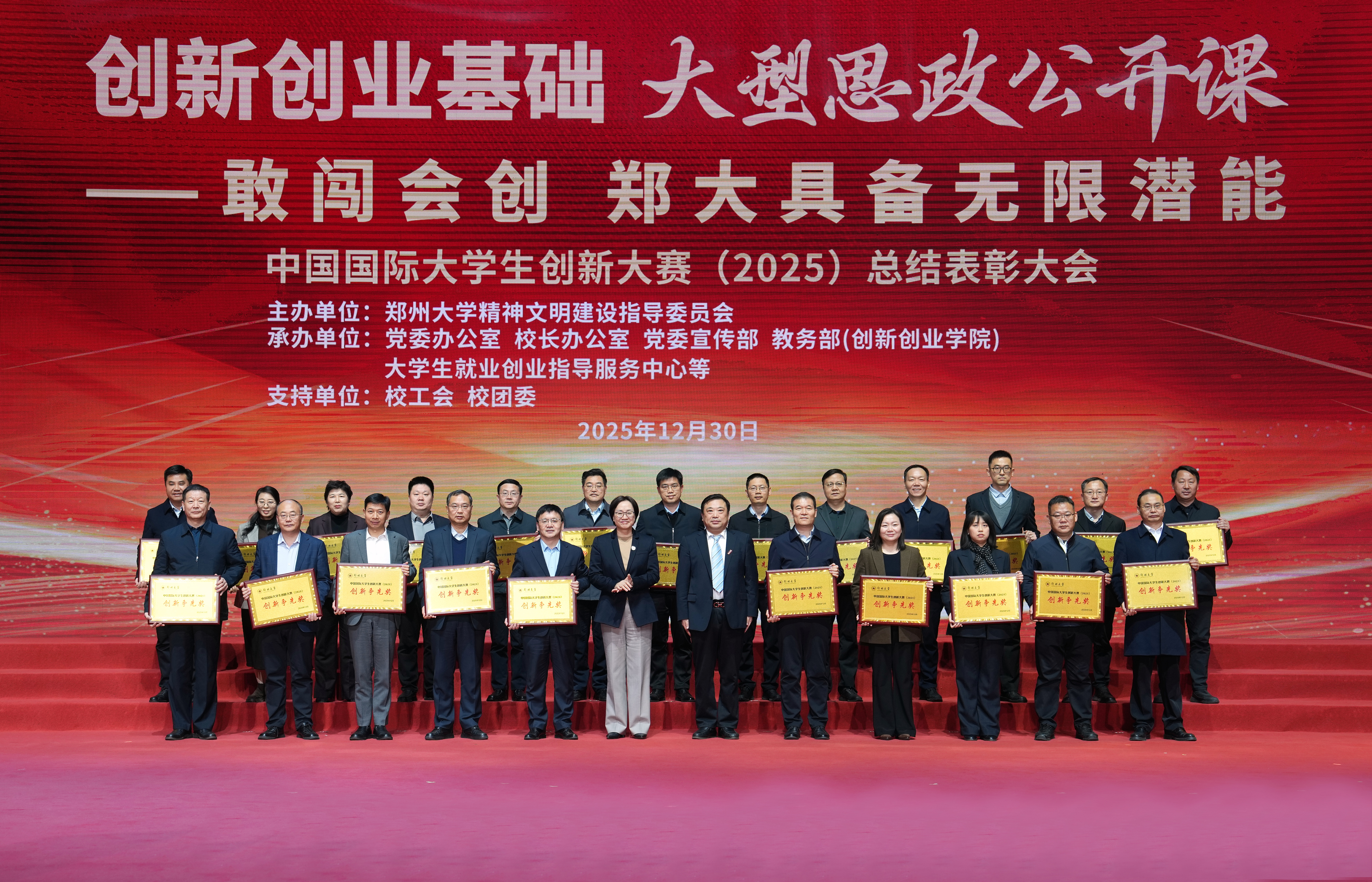 为深入落实立德树人根本任务,全面总结国创赛育人成果与办赛经验,表彰先进典型、凝聚奋进力量,并对2026年大赛进行动员部署,2025年12月30日晚,中国国际大学生创新大赛(2025)总结表彰大会暨“敢闯会创——郑大具备无限潜能”大型思政公开课在beat365在线唯一官网主校区中心体育馆举行。全体在校校领导,省教育厅、郑州市教育局有关部门负责同志出席,大赛各专项组成员、金奖项目师生代表、志愿者及师生代表约1000人现场参加,活动同步线上直播,打造了一堂气势恢宏、形式多样、内容丰富的思政“金课”。