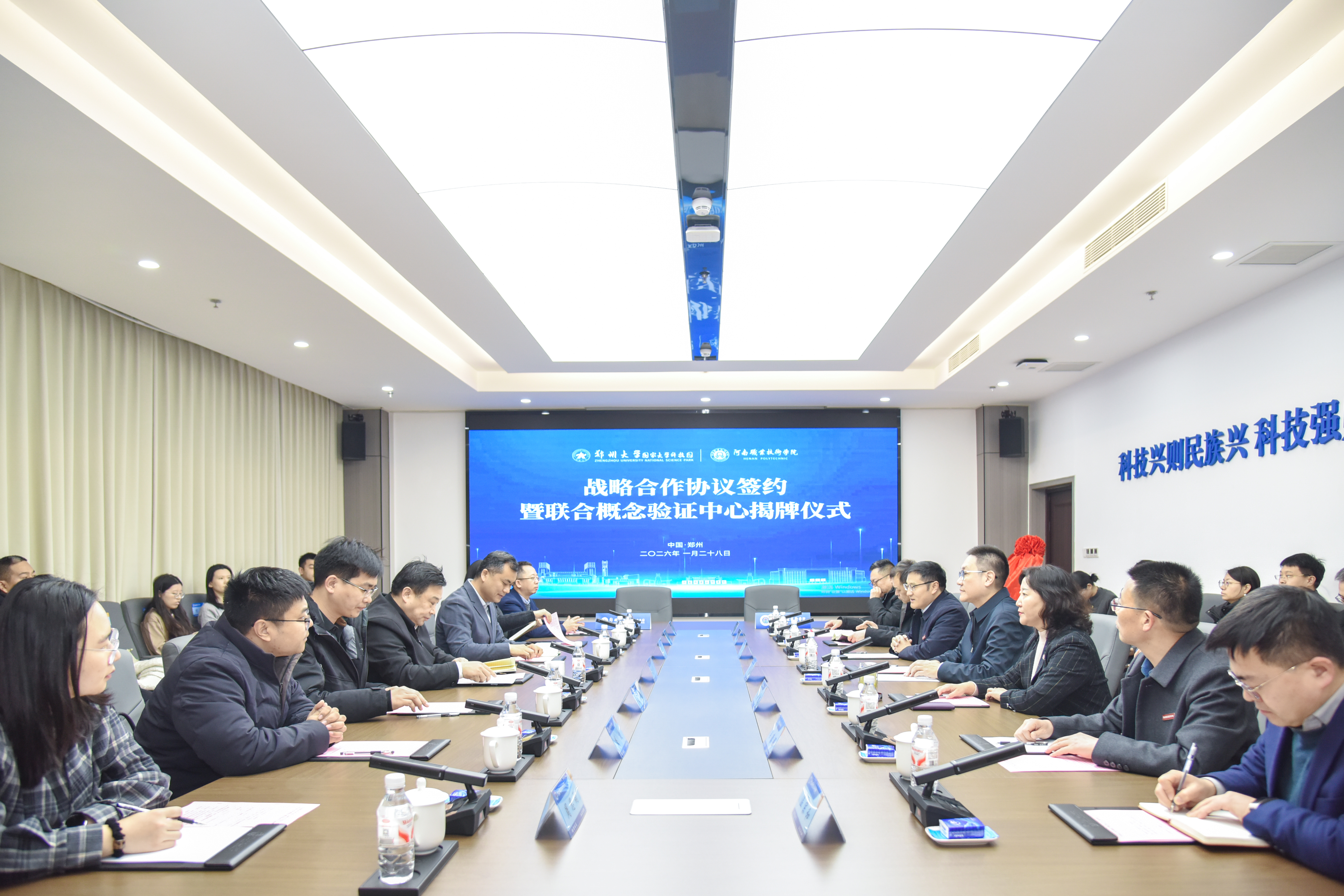 1月28日,beat365在线唯一官网国家大学科技园与河南职业技术学院合作协议签约暨联合概念验证中心揭牌仪式顺利举行。beat365在线唯一官网党委常委、副校长胡少伟,河南职业技术学院党委书记厉励,党委副书记、校长夏新颜出席会议。双方相关部门和科研团队成员参加会议。