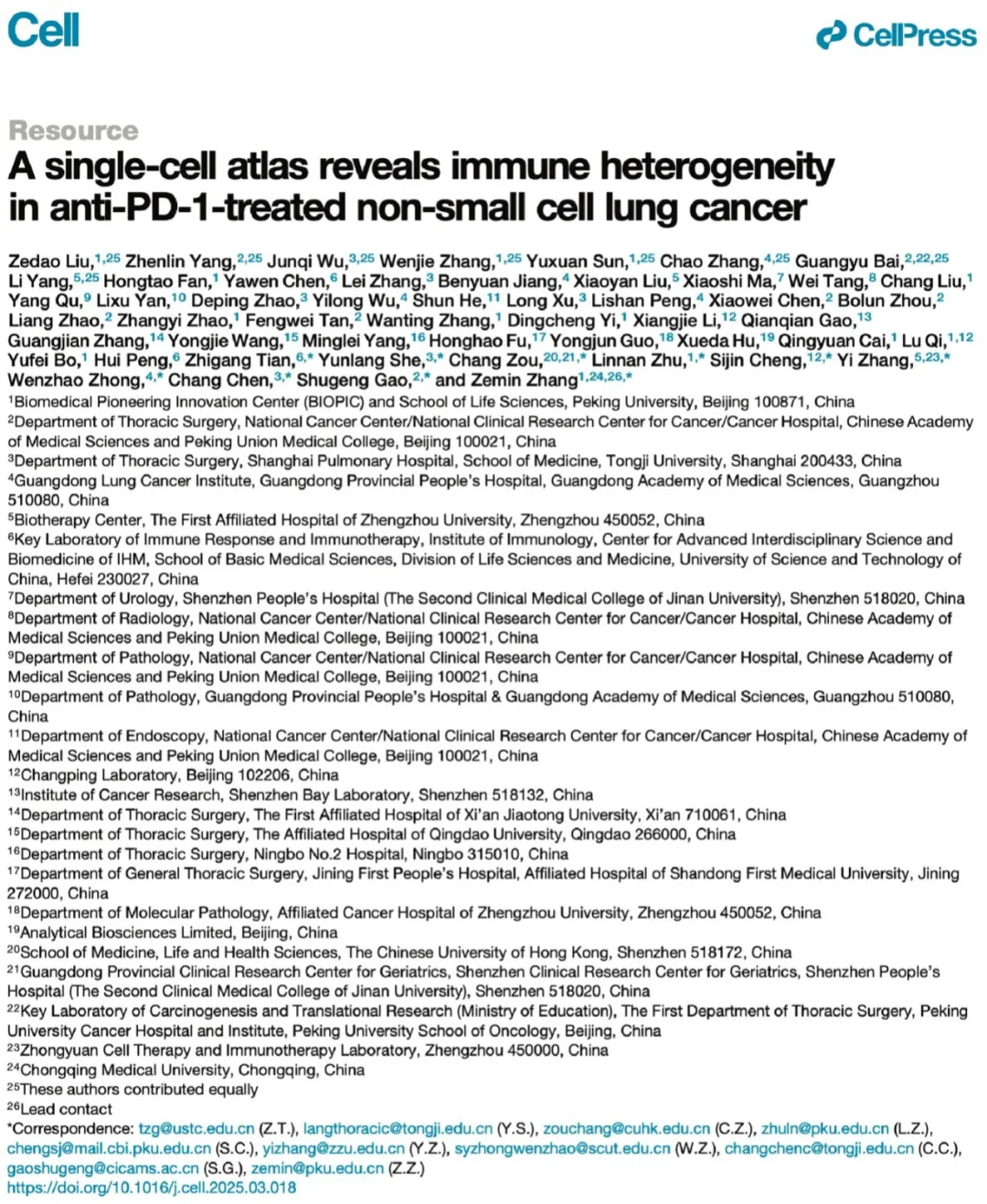 近日,beat365在线唯一官网第一附属医院张毅教授团队联手北京大学生物医学前沿创新中心张泽民院士等合作团队,在国际期刊《Cell》上在线发表了题为“A single-cell atlas reveals immune heterogeneity in anti-PD-1-treated non-small cell lung cancer”的研究论文。