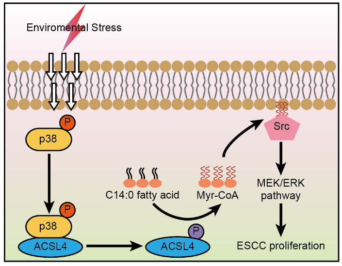 持续的外部刺激已被认为是从癌前病变发展为癌症的重要致病因素,特别是在消化系统肿瘤的发生过程中。课题组前期研究显示,p38MAPK应激通路在食管癌进展过程中活化。然而在癌前病变向食管癌演变的过程中,外界刺激引起应激途径的激活是否直接导致细胞内增殖通路的活化,进而促进肿瘤发生发展尚不清楚。本研究揭示ACSL4在食管鳞癌组织中高表达且与患者的不良预后相关,同时阐明ACSL4作为长链脂酰辅酶a合成酶家族的重要成员,其T679位点可被p38磷酸化,从而增强其酶活性,导致C14:0 CoA的产生增加,从而促进Src激酶的肉豆酰化并激活下游分子ERK。该研究团队也利用小鼠原位食管癌的诱导模型,在体内实验证实ACSL4介导的上述机制。首次阐明了ACSL4在介导应激诱导激活增殖相关级联反应并促进肿瘤发生的机制,为食管癌的防治提供新的理论依据。