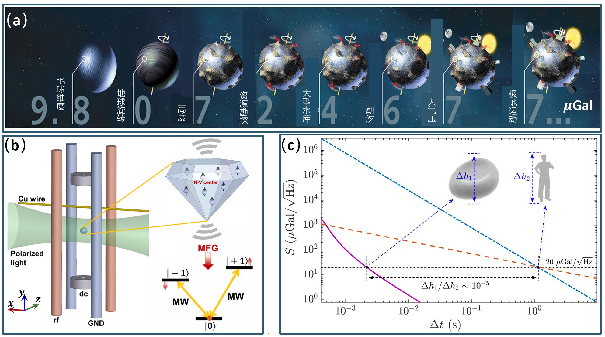 图(a)重力测量在不同精度下的应用(ESA medialab, ESA communication production SP-1314);(b)利用离子阱囚禁单个纳米金刚石颗粒构建重力仪的方案;(c)重力传感灵敏度:相同传感精度下,该方案的干涉尺寸比传统方案缩小约5个量级