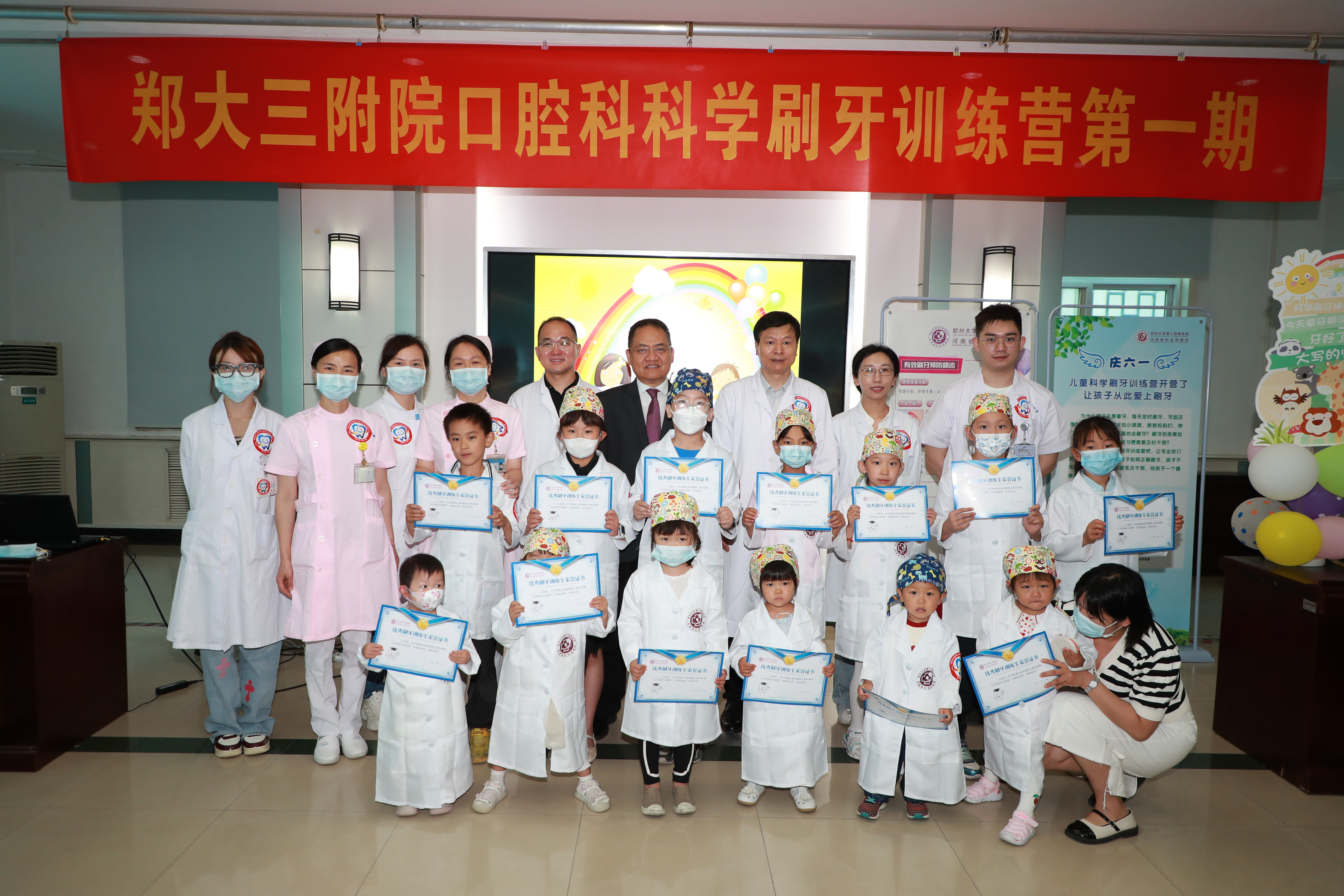在睿智楼二楼会议室,口腔科举办了首期“科学刷牙训练营”。医务人员和宝贝们共同走进“科学刷牙训练营”,医院班子成员为小训练生们颁发了“优秀刷牙训练生”的证书。