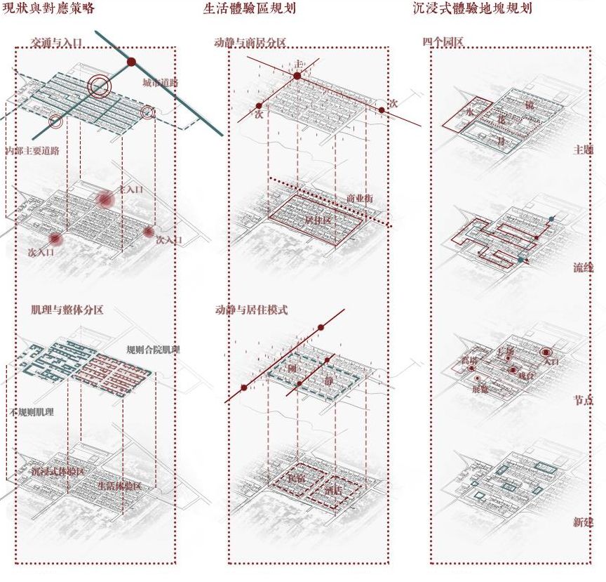 在老师的带领下,团队设计逐渐步入正轨。在如何提高园区的趣味性、更好地吸引游客这一问题上,陈琛建议她们多联系生活中的流行艺术。这一建议启发她们想起了“沉浸式戏剧”这一时下新兴的表演方式,并最终选择这一理念作为设计核心。她们梳理了小西村的资源优势,集中体现在渔、海、市、海草房四个方面,接着尝试用文、游、戏、商四种方式对资源进行整合,同时根据现有布局和容量大小重新划分功能区,分为沉浸式体验区和住宅区两大部分。