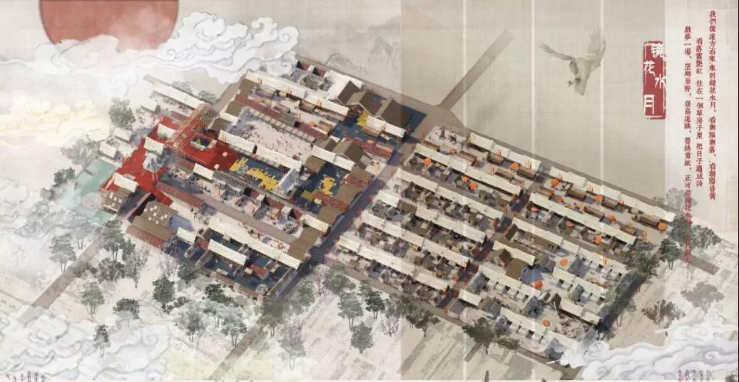 团队在规划的沉浸式体验区内设置了“镜”“花”“水”“月”四个园区,以沉浸式剧场为空间要素,融入原创故事情节,为游客提供“入镜——花戏——水乡——月苑”四重空间体验。