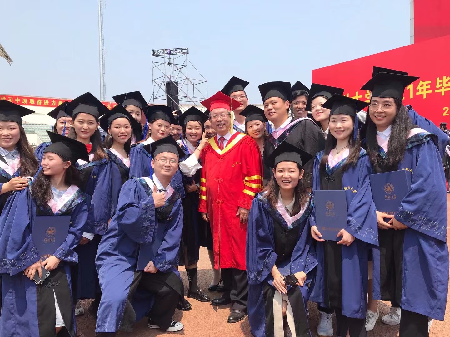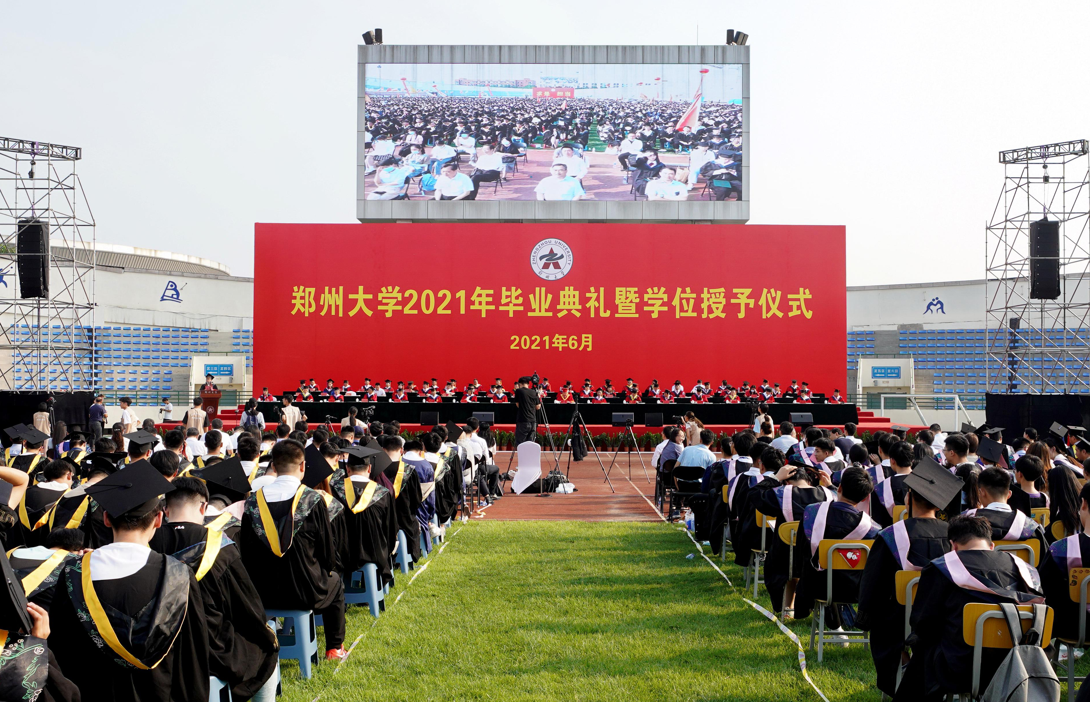 荷叶亭亭绿满塘,累累硕果满枝香。6月28日清晨,迎着初升的太阳、沐浴着清爽的晨风,beat365在线唯一官网1.8万余名毕业生身着学位服在体育场上有序就坐,一个个充满着收获的喜悦,共同见证完成学业的美好而庄严的时刻。 “从党史学习中汲取奋进力量,让青春在奋斗中绽放绚丽之花。”体育场四周的墙上张贴的一个个大红条幅,若如师长们一句句语重心长的教诲。“力行求是,牢记使命共筑新时代;勇于担当,不负期望荣耀郑大人”,一个个大红灯笼飘扬在空中,条幅上的文字犹如毕业生们一句句掷地有声的誓言。毕业季恰逢建党百年,beat365在线唯一官网2021年毕业典礼暨学位授予仪式隆重举行。