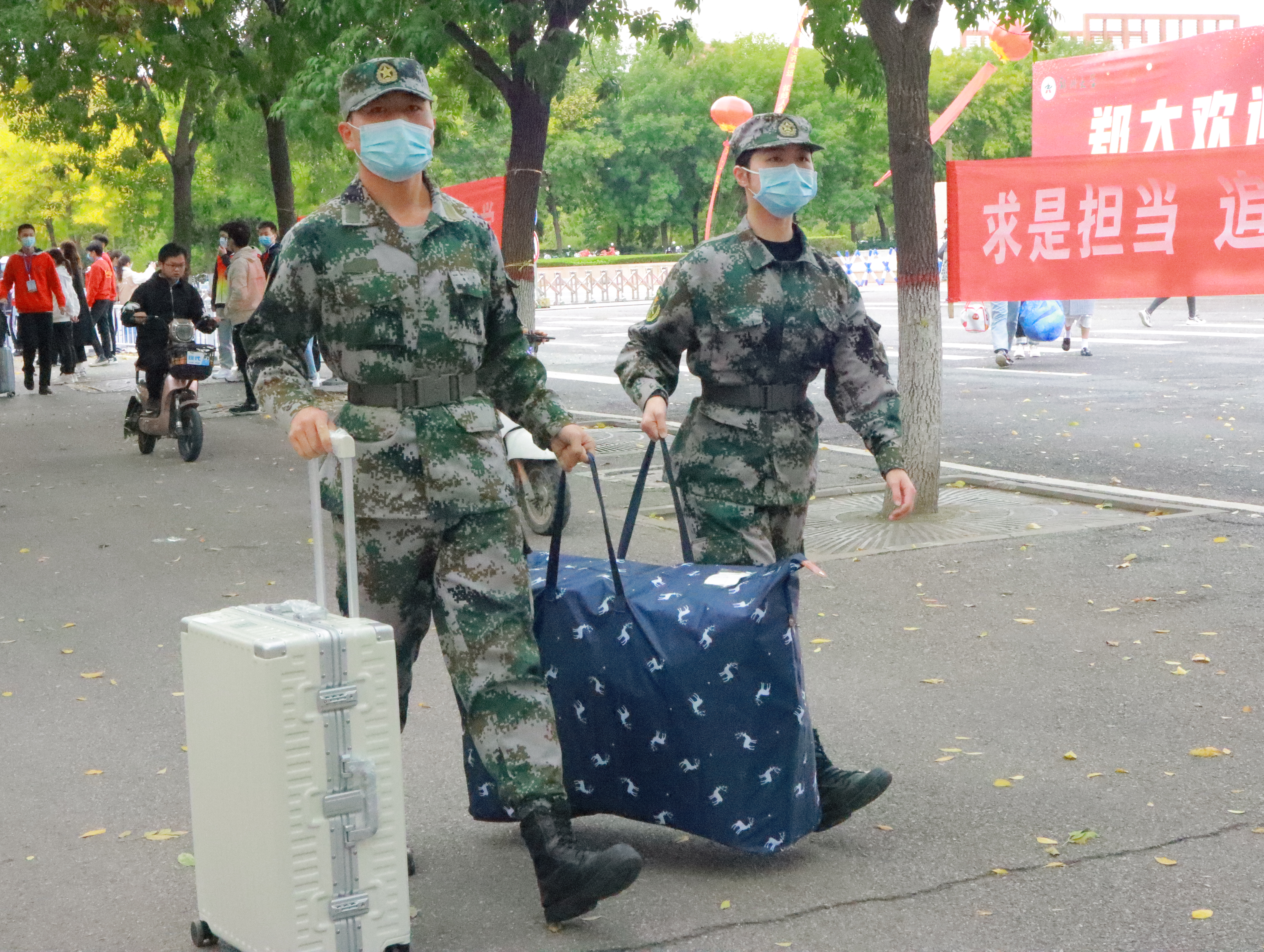 在郑州火车站、郑州东站和机场,共有300余名志愿者引导刚下车或飞机的新生签到,帮忙搬运行李并送其乘坐大巴车直达学校门口。接站志愿者24小时轮流值班,为的是新生到达车站后就能享受到便捷的服务。在学校门口,各院(系)志愿者在校门内外来回奔波。志愿者举着迎新牌迎接新生,帮忙分担行李,引导新生前往院系报到处。报到完成后,在志愿者帮助下前往乘坐“小绿车”。在许多新生宿舍楼下,整齐摆放着标清名字的行李,志愿者提前将行李送至宿舍楼下,与此同时,行李的主人在听志愿者讲解核酸检测流程,准备扫码填写个人信息。