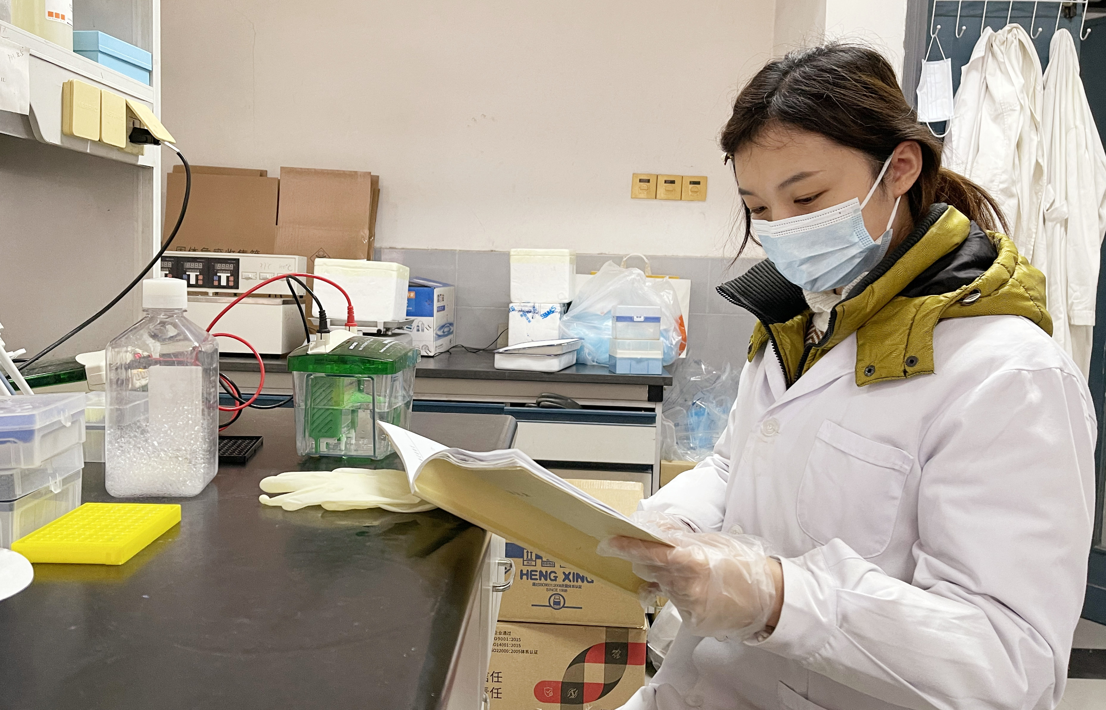 公共卫生学院的大楼,由于少了一大批支援抗疫一线的师生们而显得有些安静。然而,走进大楼实验区却是另一番景象,寒假坚持留校继续科研工作的研究生们,身穿白色工作服依然在忙忙碌碌。他们或在超净工作台前聚精会神地操作,或者有条不紊地完成实验,亦或在紧张、期待中目不转睛地观察实验结果。