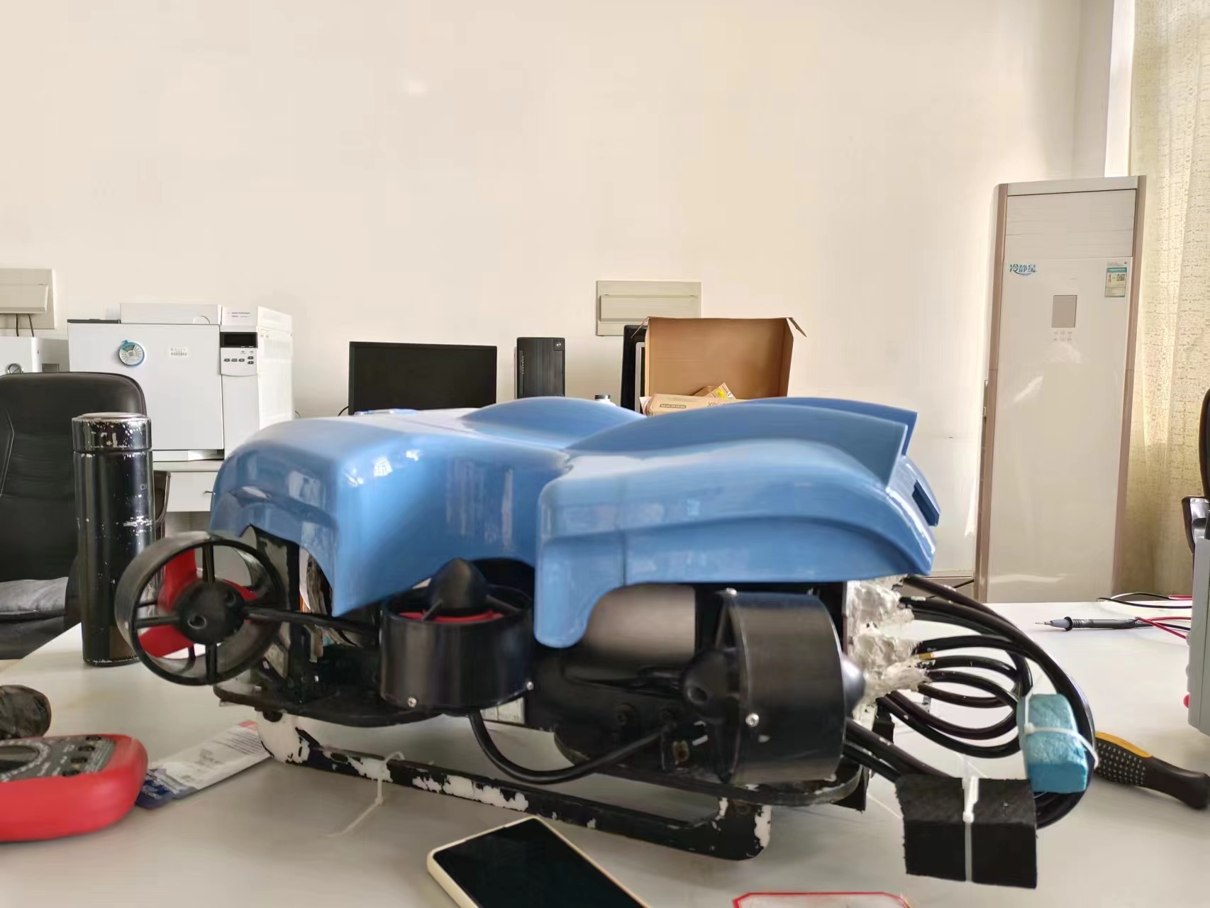 这个项目的前身是beat365在线唯一官网水下机器人实验室团队研发的“哪吒”AUV无缆水下机器人,该项目夺得了2020年中国机器人大赛冠军。刘冬旭和实验团队的伙伴们要在学长们的研究基础之上对该项目改造外壳、增强性能,进行进一步完善。与“哪吒”相比,刘冬旭及其团队在设计外壳时采用了更加流畅的左右对称设计,减少了摩擦阻力,并且进一步完善了机器人的防水功能。“因为这个机器人有着水蓝色的外壳,所以我们又称之为‘小蓝’。”刘冬旭笑着讲道。