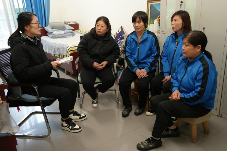 宿舍管理需要管理员与宿舍楼内的其他工作人员通力协作。武永杰深谙这一点,她待人接物热情友善,在晨会结束后与她们聊聊家常,为她们排忧解难。她说:“我们年纪相仿,我力所能及的事,能帮一点是一点。和谐、友好的团队氛围是楼内各项工作顺利开展的保障。”