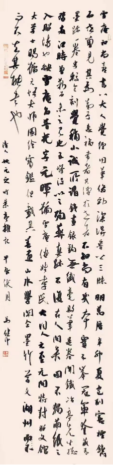 “入选兰亭奖,对我来说是个惊喜。”马健中说。报名兰亭奖需要提交三幅作品,当时他正全力筹备两个展览,展览时间与兰亭奖参评时间冲突,他书写得十分匆忙,并没有像往常一样对作品反复打磨。即便如此,最终结果仍令人满意。“这次创作的心态是,现在年龄大了,没有了羁绊,笔墨蓬勃活泼,甚至心无挂碍地去写。”马健中表示,思想更解放,情感抒发更自由,能做到功夫和心性统一,审美和表达结合了。