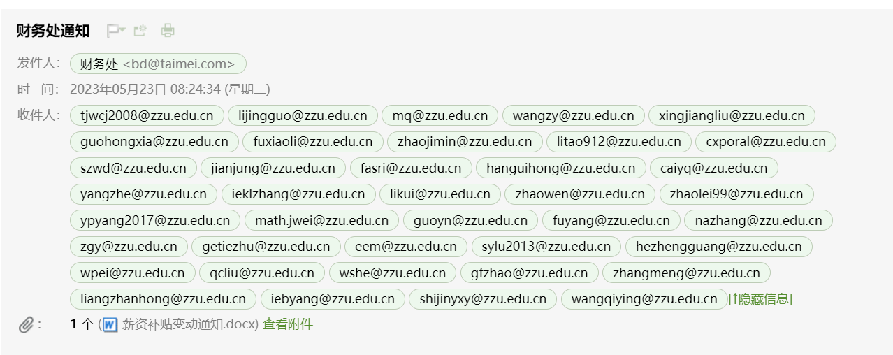 今天我处接到部分教职工反映学校邮箱收到“薪资补贴变动”通知,邮件标题为“财务处通知”,发件人为“财务处 <bd@taimei.com>”。邮件附件为“薪资补贴变动通知.docx”。详见下图: